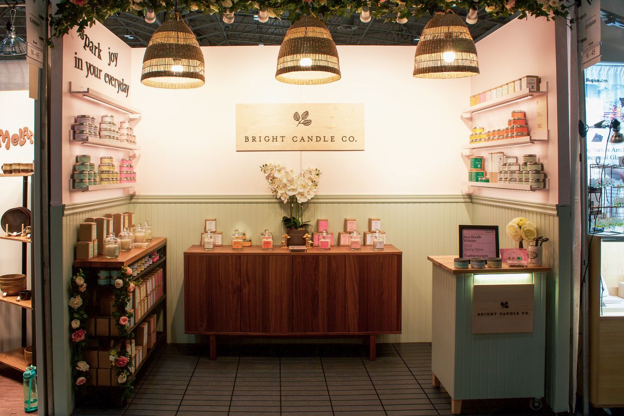 This Toronto-based candle company nabbed a spot in the winner’s circle in part by placing its smelling stations along the back wall of its booth, which helped draw customers into its space. Also playing a big part was the lighting; track fixtures hidden by a garland of florals and a trio of woven basket pendants created an attractive romantic ambiance.